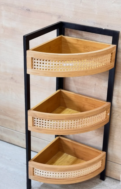 A space-saving three-tier corner storage rack featuring woven-style baskets supported by a sturdy black metal frame. Designed to fit neatly into corners, this organizer maximizes vertical space while keeping items easily accessible. Ideal for kitchens, bathrooms, or laundry areas, it offers a stylish blend of functionality and modern design.
