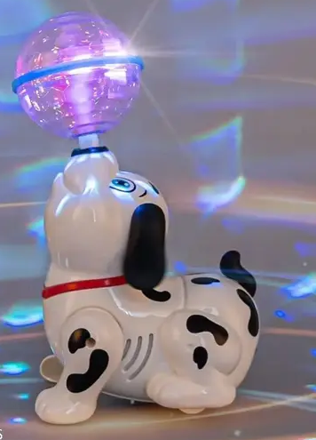 This adorable puppy toy brings instant fun and color to any room. Designed with a cute spotted body and a playful pose, it features a glowing, rotating disco ball on its head that projects colorful light patterns around the space. As it moves, the lights create a lively, party-like atmosphere that kids love. Made from smooth, durable plastic with rounded edges, it’s safe for little hands and perfect for playtime, parties, or as a cheerful decorative toy. 🐶✨
