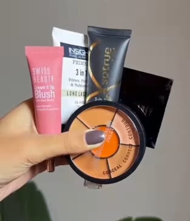 A hand holding a set of everyday makeup products, including a blush tube, primer, foundation, and a multi-shade contour/highlighter palette. The compact and minimal selection highlights essential beauty products for a quick and natural makeup routine, with a clean and aesthetic presentation.