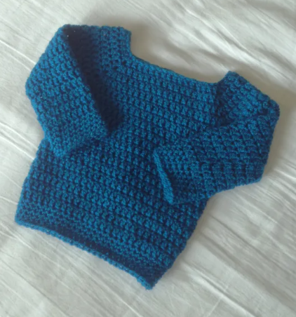 This adorable handmade crochet baby sweater is crafted with soft blue yarn, perfect for keeping little ones warm and cozy. Featuring a simple yet charming textured stitch pattern and long sleeves, it’s ideal for everyday wear or as a thoughtful handmade gift. The open neckline allows for easy dressing and comfort. Suitable for infants or toddlers, this sweater blends warmth, softness, and handmade charm beautifully.