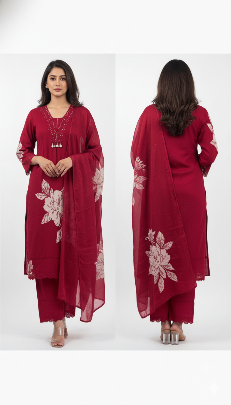 Crafted with care, this set features a pure silk kurta, coordinated pants, and a specially designed attached dupatta, ensuring a seamless and polished look. The rich silk fabric provides a smooth texture, subtle sheen, and effortless drape, making it a must-have for every fashion-conscious woman.